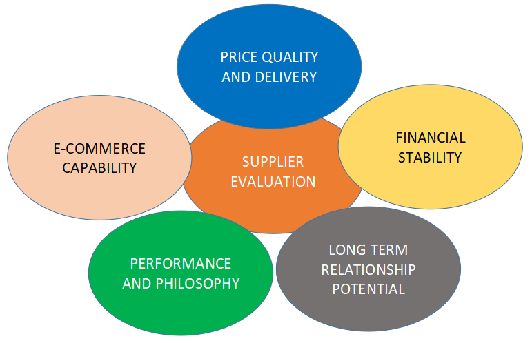 The Key factores of a Supplier evaluations are: 1. E-Commerce Capibility 2. Price and Delivery 3. Financial Stability 4. Long Term Relationship Potential 5. Performance and Philosophy